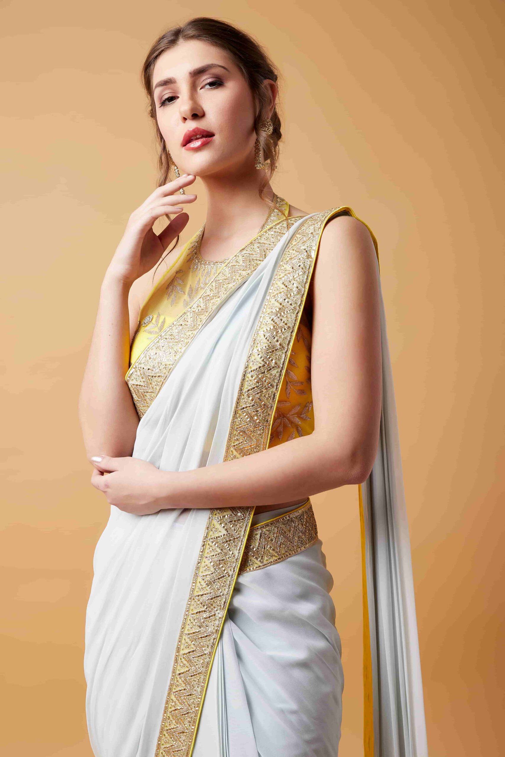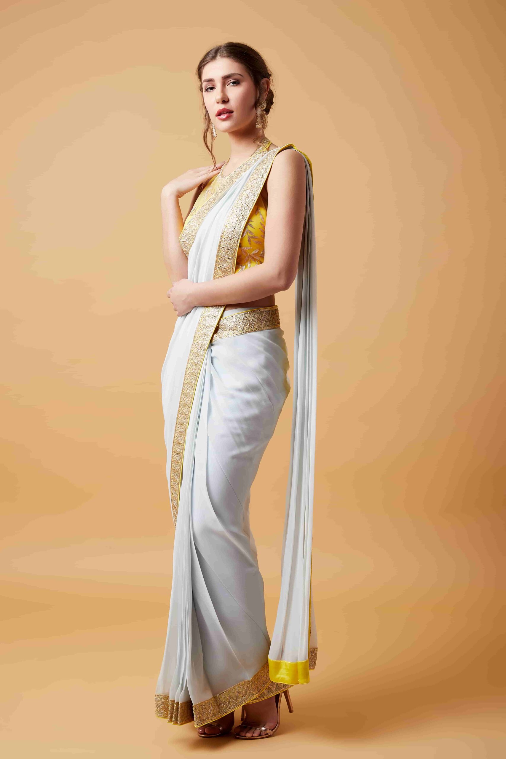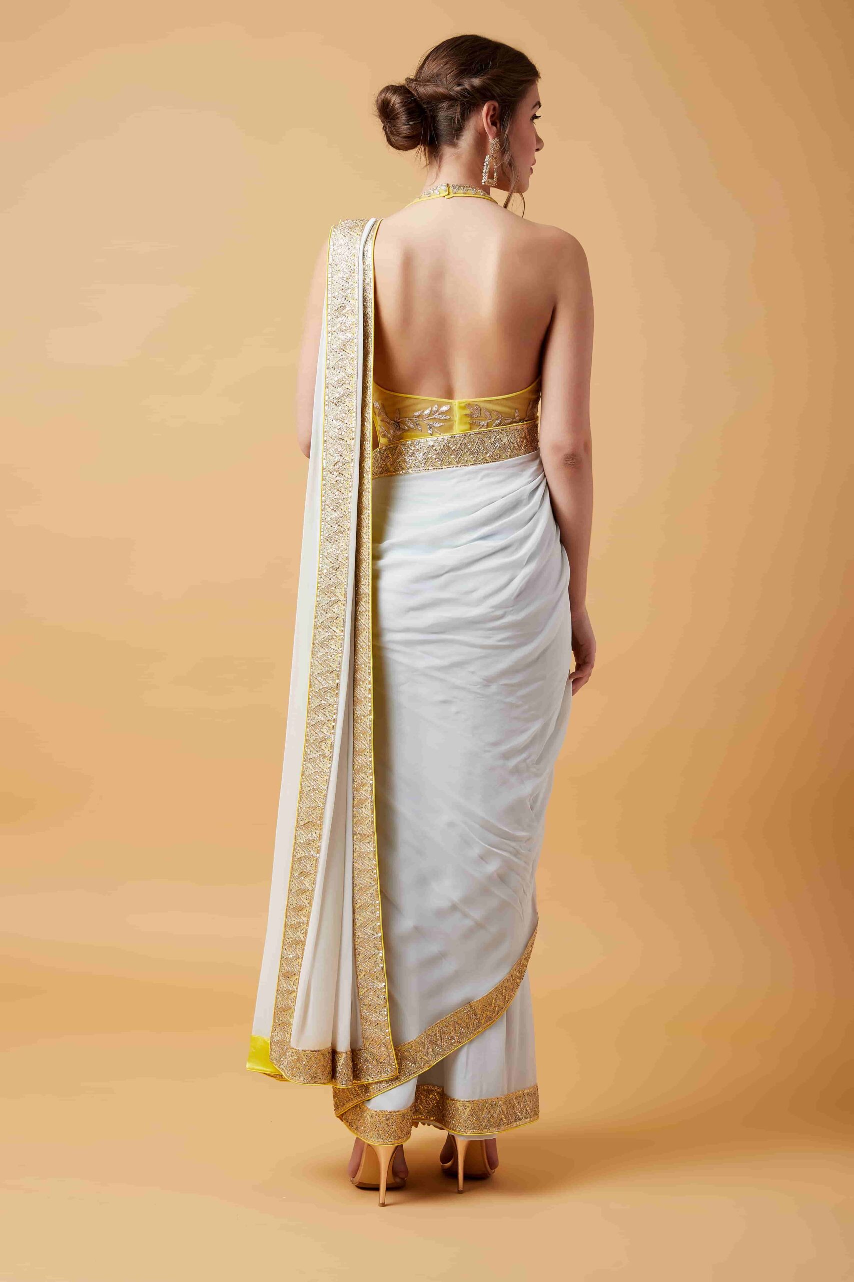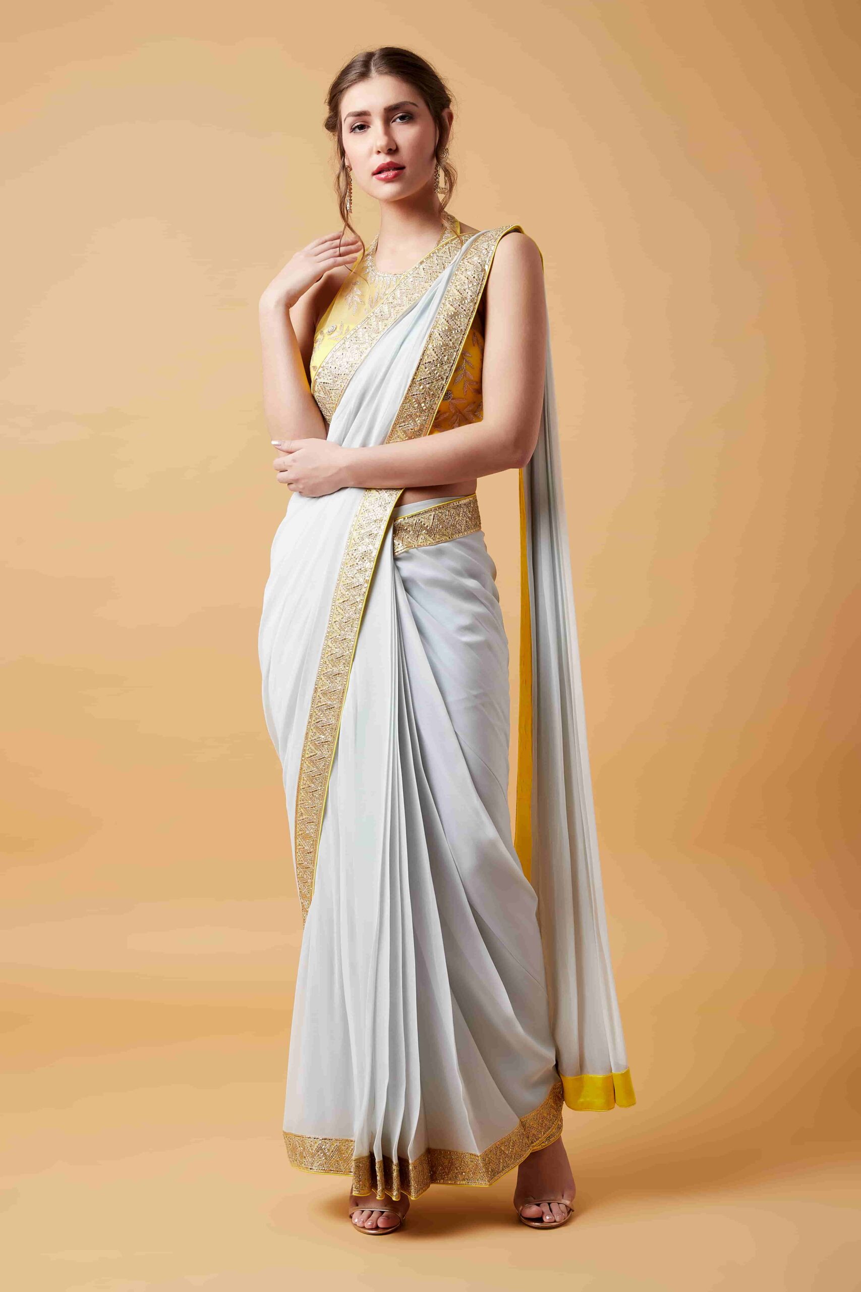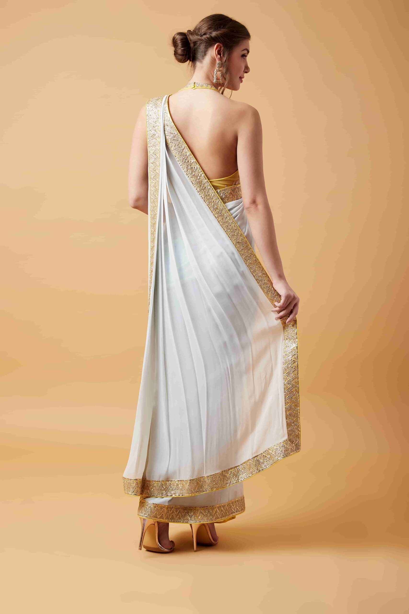 Alter Neck Lemon Blouse & Light Grey Pre Stitched Saree quantity