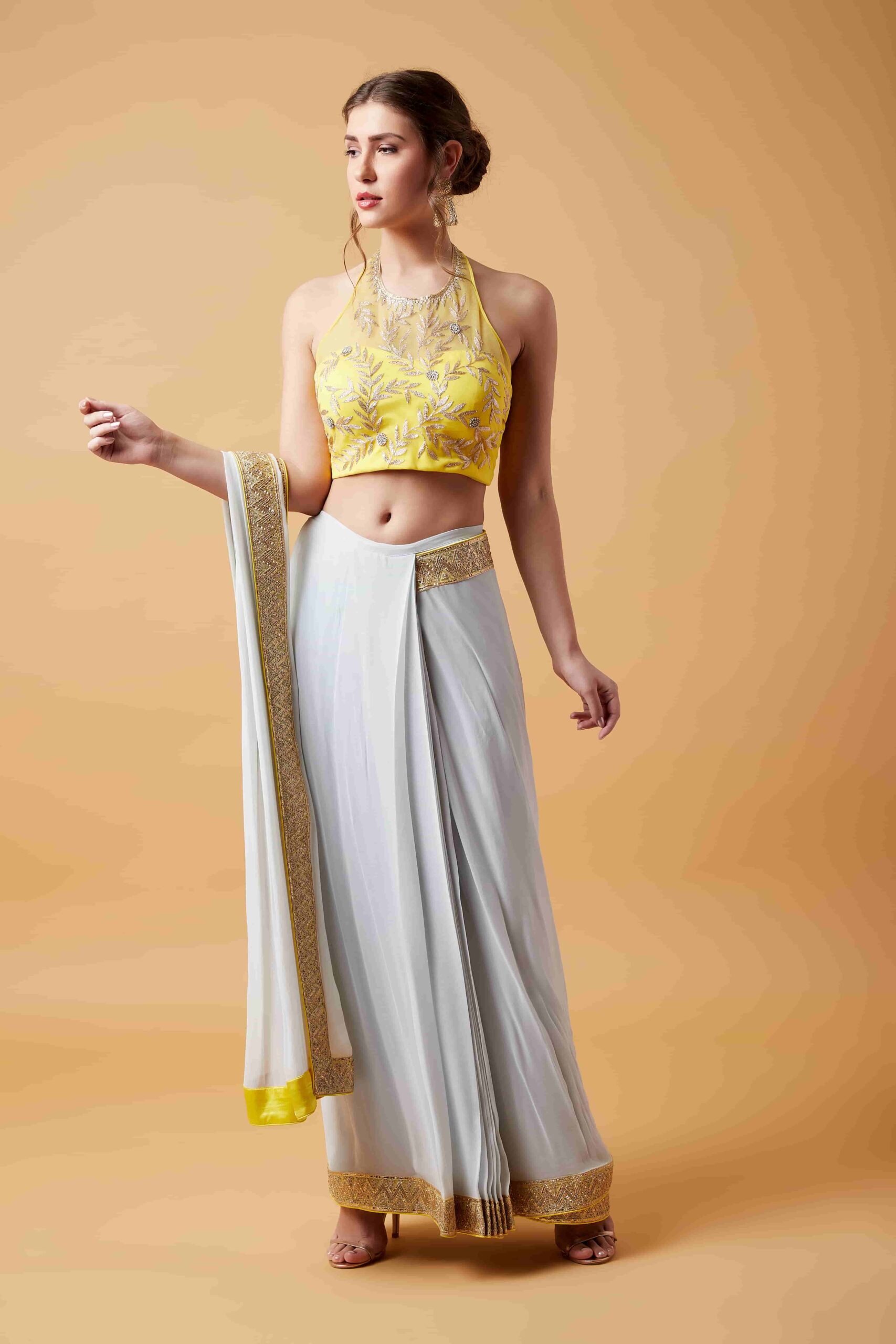 Alter Neck Lemon Blouse & Light Grey Pre Stitched Saree