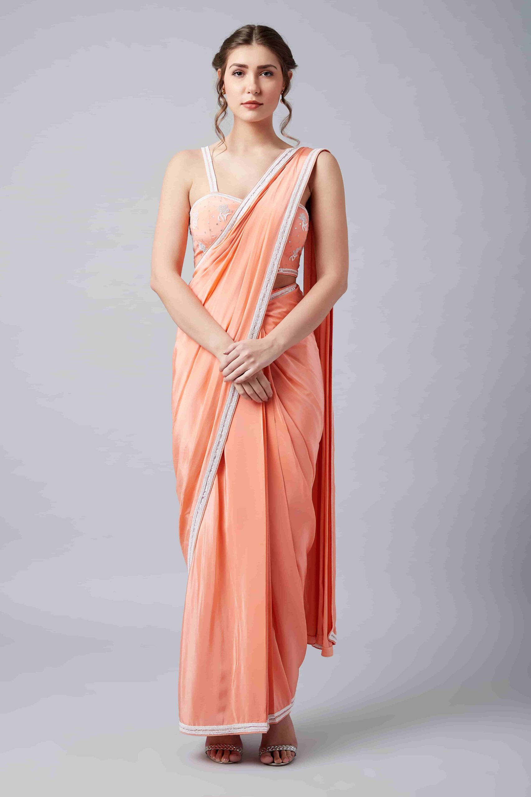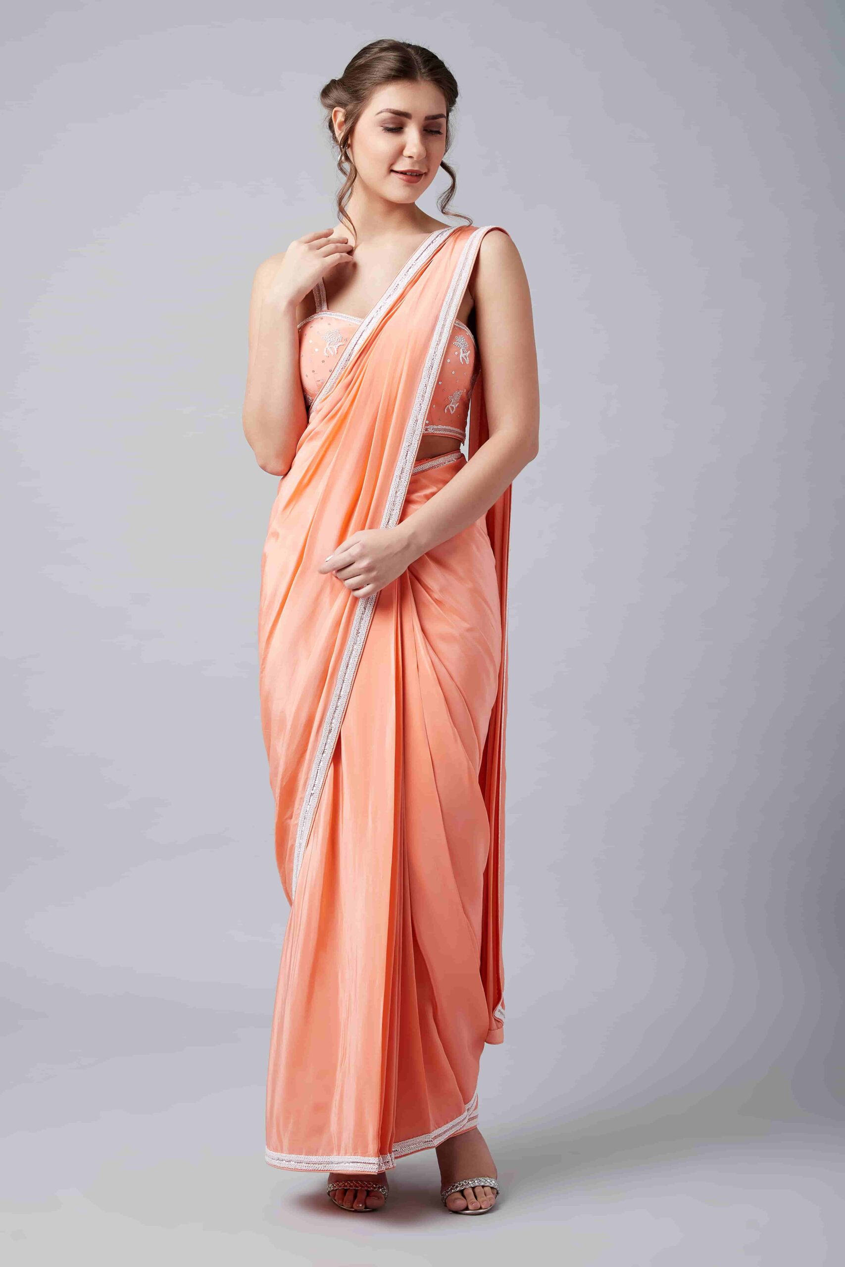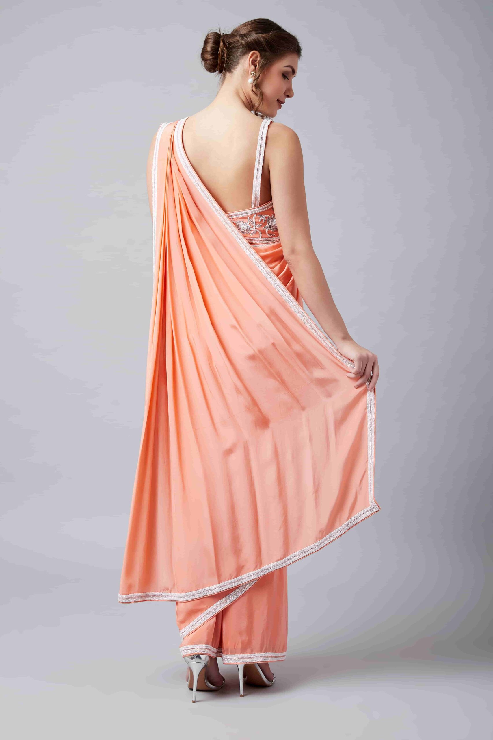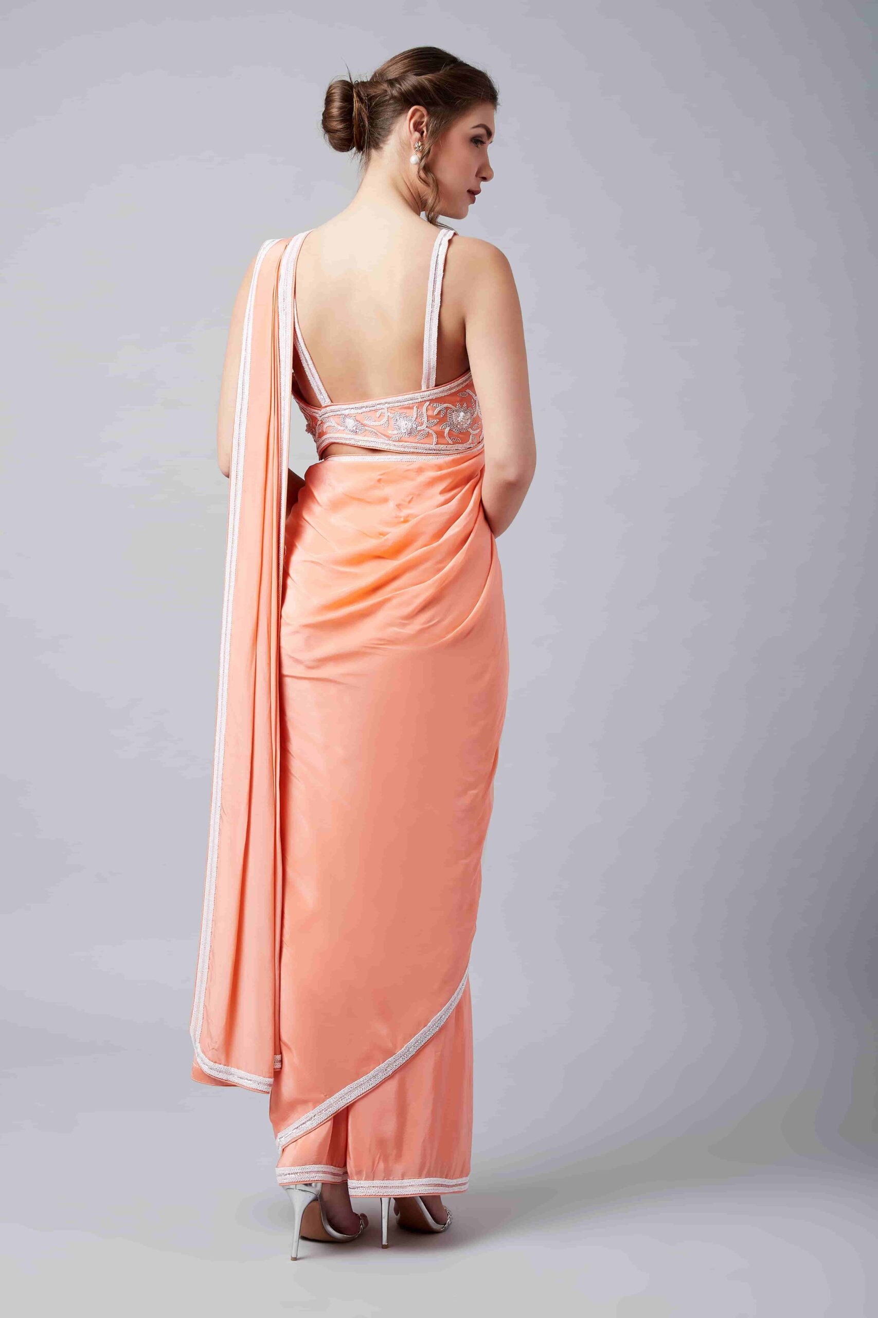 Orange Crepe pearl Embroidery Blouse & Pre-Stitched Saree